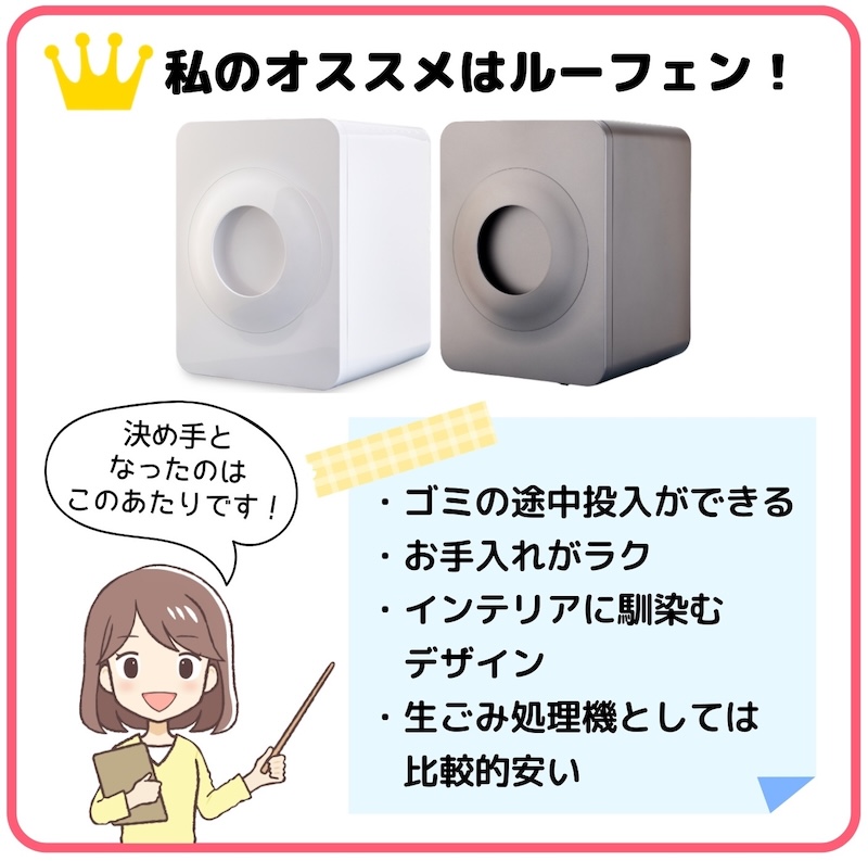 パリパリキューは値段が安いので惹かれるとは思うのですが、長く使っていると「ゴミの追加投入ができない」というデメリットがじわじわとストレスになってくると思いますので、私としては多少値段が高くてもストレスフリーなルーフェンをオススメしています。