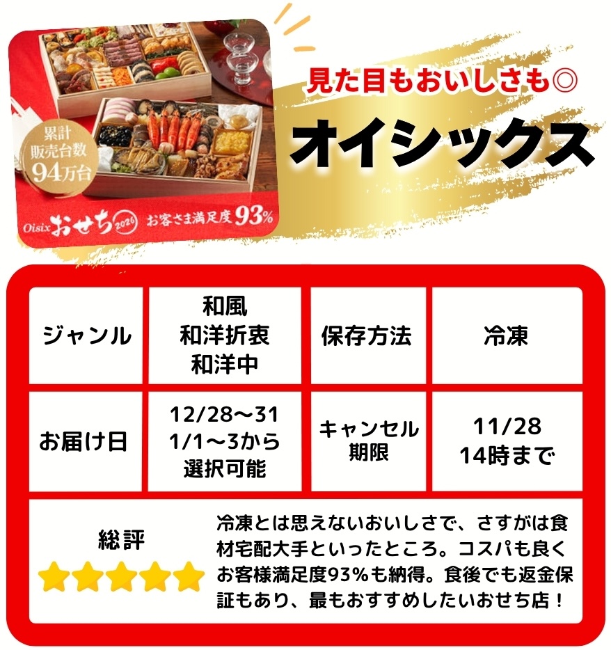 食材宅配大手Oisixの大満足おせち! 有名シェフ監修やオリジナル多彩。 食材品質にこだわり、 子供向けや洋風おせちも人気。 »詳しい解説はこちら |