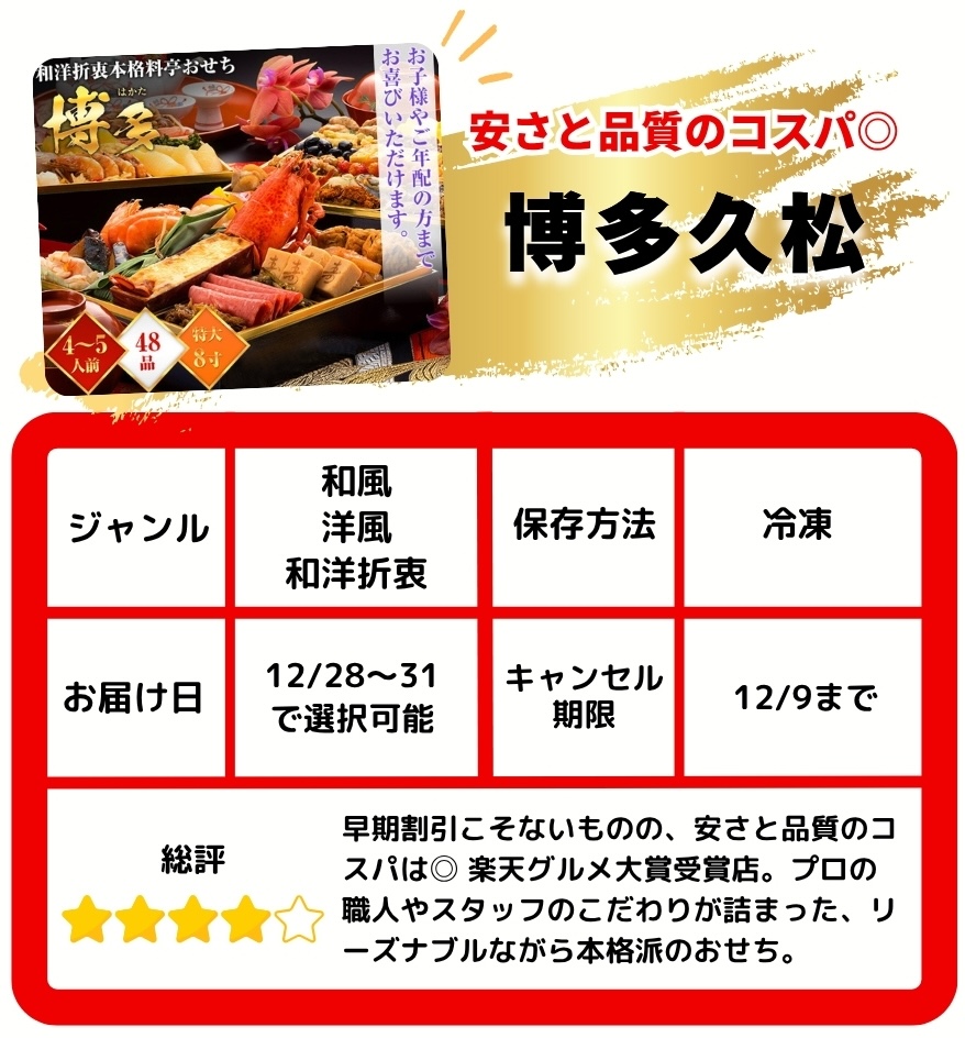 ボリューム満点&コスパ良し! おためしおせちやカタログもあり 選びやすさに定評あり。 »詳しい解説はこちら |