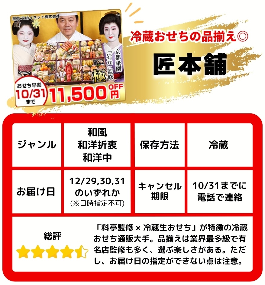老舗料亭監修がウリのおせち。 京都・大阪など全国の 有名料亭と提携し、種類豊富! »詳しい解説はこちら |