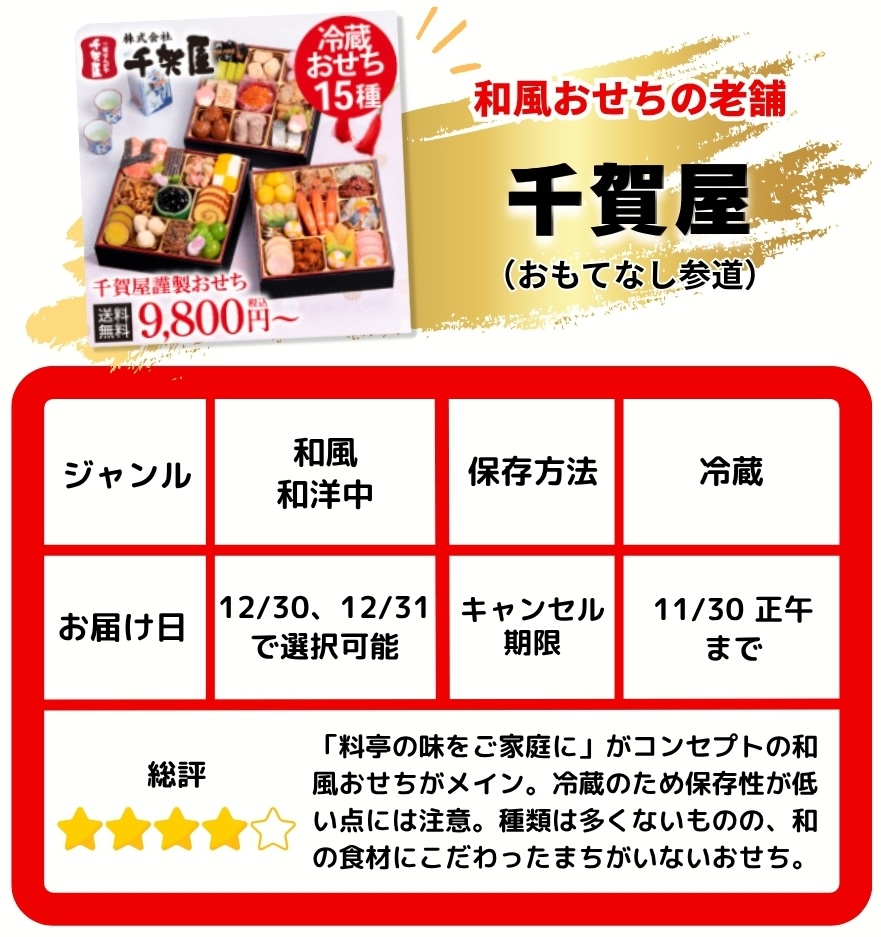千賀屋も他店と同じく、人気のあるおせちは毎年12月を待たずして売り切れるので、ぜひお早めにご予約くださいね。